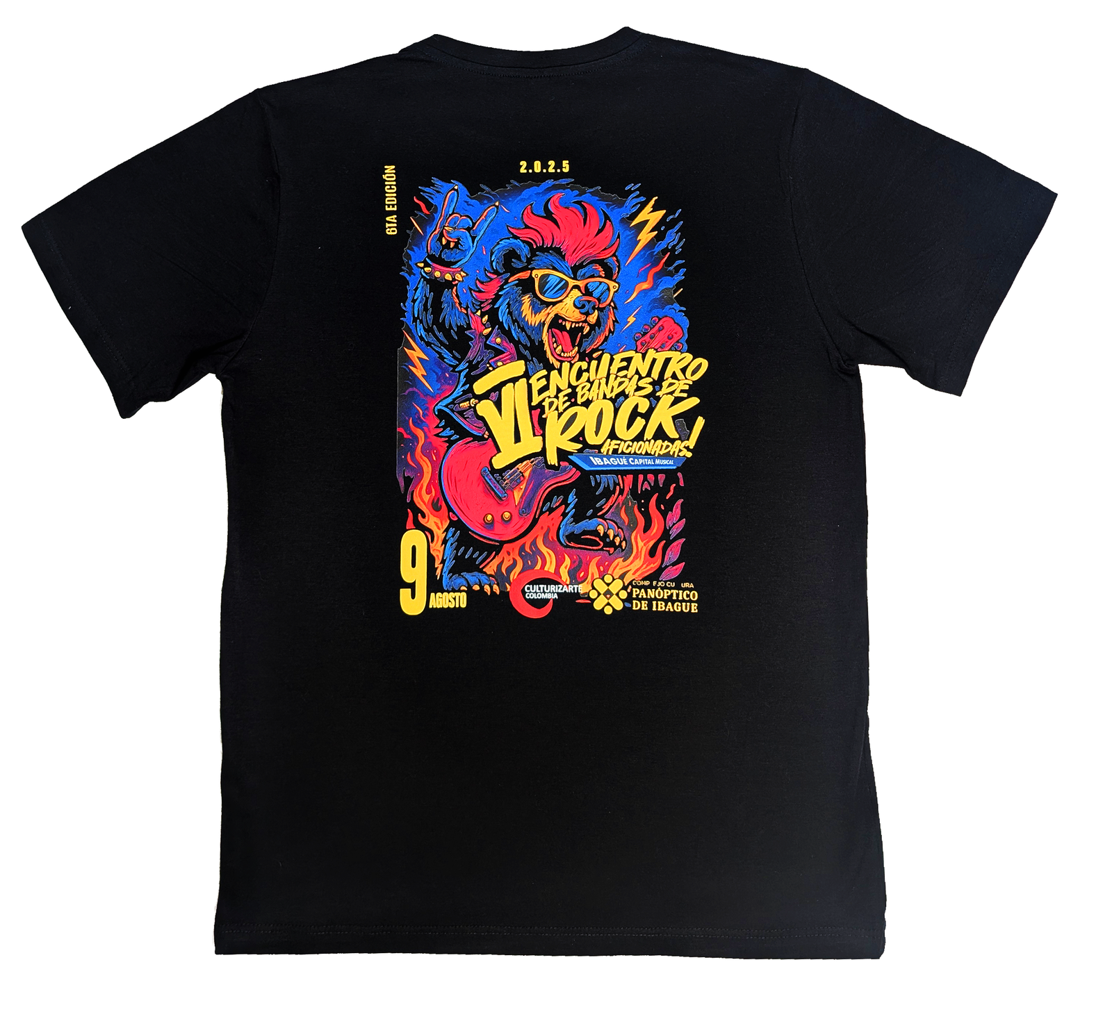Adquiere en preventa la camiseta oficial del VI Encuentro de Bandas de Rock Aficionadas Ibagué Capital Musical, con el diseño exclusivo del afiche oficial del evento. Una prenda de colección para los verdaderos amantes de la música alternativa local.